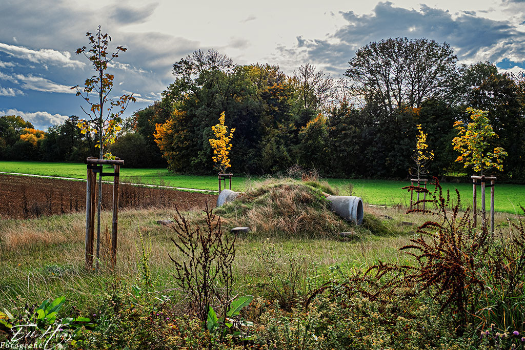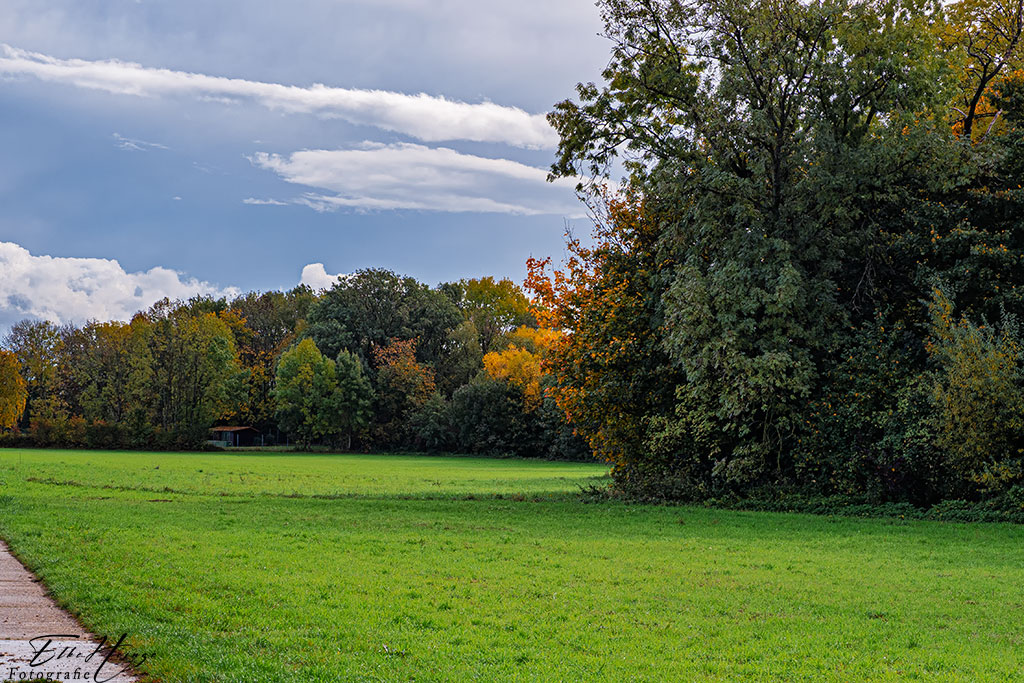 Hinter den Baumreihen fließt der Liederbach. Das ist sicher, ähnlich wie bei den Bäumen an der Nidda, der Grund, weshalb sie noch ziemlich grün sind. Aber sie bekommen dort auch im Tagesverlauf nicht so viel Sonne ab, wie zum Beispiel die Bäume auf der anderen Seite, an der die Landstraße entlang läuft. Dort ist es viel bunter. Es ging mir gestern nicht gut, sonst wäre ich vielleicht dort auch eine Weile entlang gelaufen, obwohl Landstraße zum Laufen keinen Spaß macht.