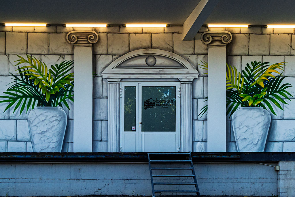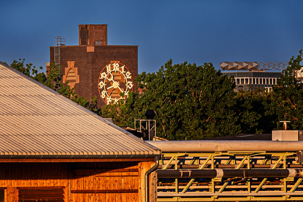 Im Headerbild seht einen kleinen Blick zum Industriepark. Das war kurz vor halb neun auf der Hälfte meines Spaziergangs. Wer erinnert sich noch an das alte Logo der vormaligen Hoechst AG, das im letzten Jahrhundert an fast allen Apotheken im In-und Ausland zu sehen war? Turm und Brücke, das kannte man und ist heute fast in Vergessenheit geraten. Gerne würde ich den berühmten Peter-Behrens-Bau bei einer Rundfahrt durch den Industriepark mal fotografieren, aber selbst bei diesen geführten Touren sind Fotos strengstens verboten. Immerhin seht ihr ein winziges Stück des Turms mit der alten Uhr.