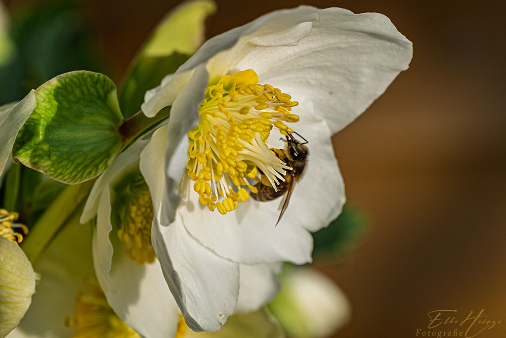 Zum Schluss noch eine verheißungsvolle Knospe und nochmal eine Christrosenblüte mit Biene.