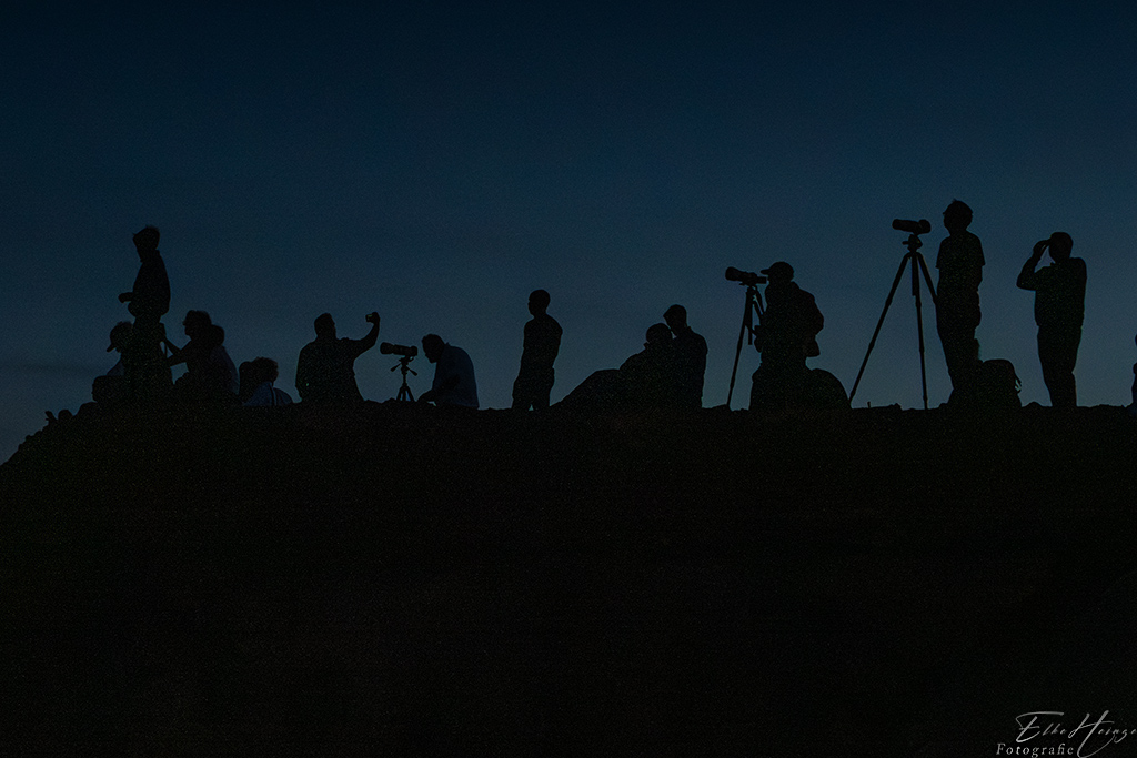 Allmählich brachen die ersten schon wieder auf, bis die scharfen Augen eines Jungen plötzlich etwas erspähten. „Da, ich sehe ihn!“ Und tatsächlich, er stand schon viel weiter oben am Himmel, als wir erwartet hatten und trat schon wieder aus dem Kernschatten aus. So wurde er überhaupt erst sichtbar. Vorher war er einfach zu dunkel gewesen.