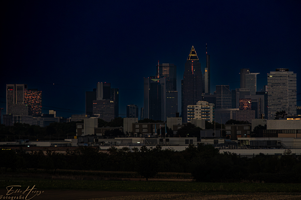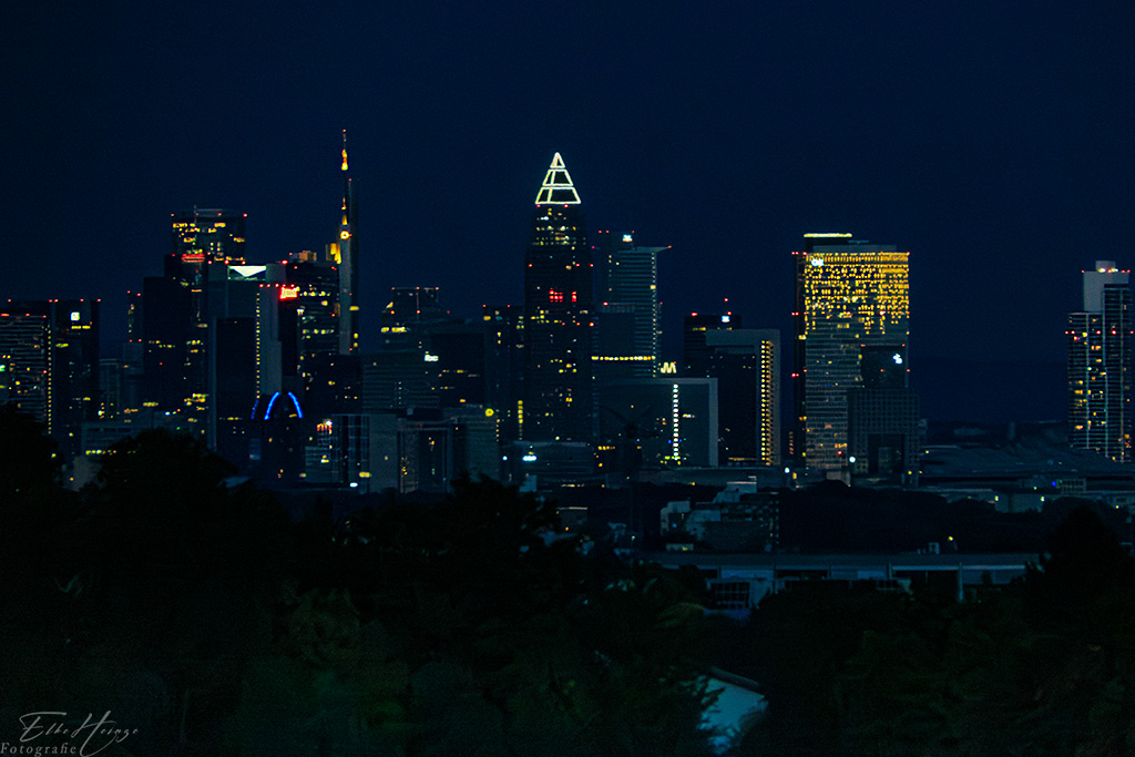 Nur ein Blutmond war auch von hier aus nicht zu sehen. Also nochmal Skyline fotografiert und ein Lichtermeer, bei dem ich mir nicht ganz sicher bin, was ich da eigentlich sehe. Irgendwie sieht es aus einer Mischung aus Industriepark vorn und Flughafen weiter hinten aus. Die schemenhaften Berge in Hintergrund müssten zum Odenwald gehören. Aber ohne Gewähr.