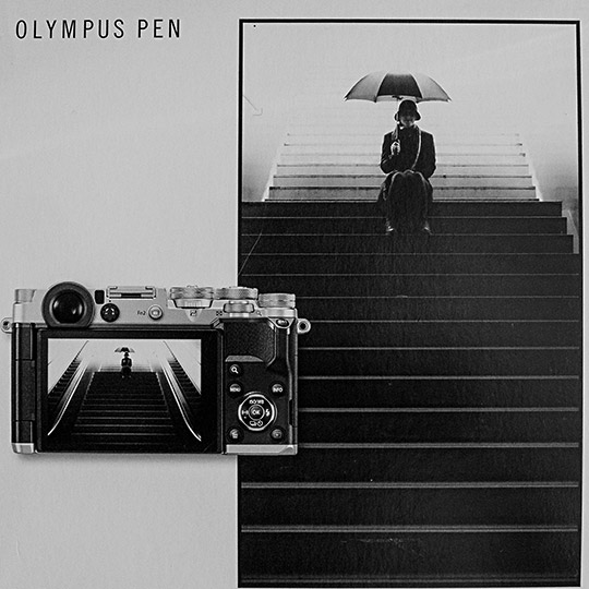 Rückseite der Verpackung. Dass die Dame dort mit Regenschirm sitzt, ist nicht ohne eine gewisse Ironie zu betrachten. Denn anders als meine Oly ist die PEN-F leider nicht wassergeschützt.