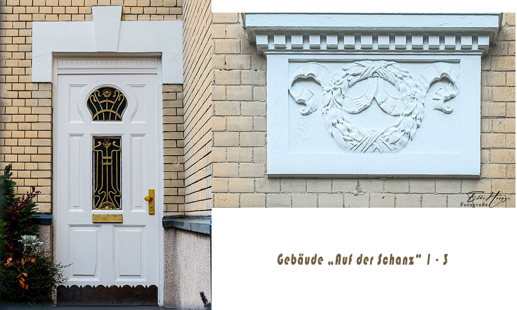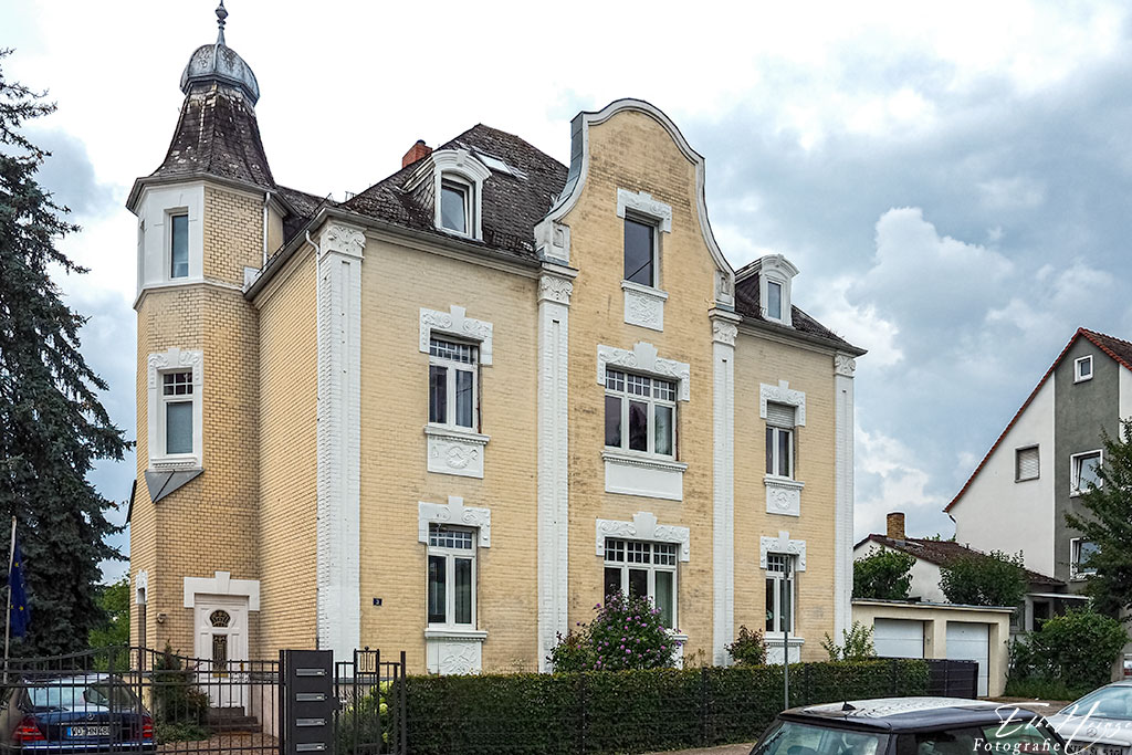 Dass die Fassade an einigen Stellen doch etwas schmutzig ist, fiel mir erst am PC auf. Als ich davorstand, habe ich das gar nicht so bemerkt. Die schöne Haustür im Art Deco-Stil scheint neu sein. Ich habe über dieses Haus (Adresse: „Auf der Schanz“) im Internet leider überhaupt nichts gefunden, was mich schon verwundert hat. Der Bauherr muss zwar gut betucht gewesen sein, aber offenbar niemand von großer Bedeutung im damaligen Örtchen Sossenheim. Er könnte durchaus auch ein höheres Tier bei den Farbwerken Hoechst gewesen sein. Ich schätze mal, dass das Haus um 1900 erbaut wurde.