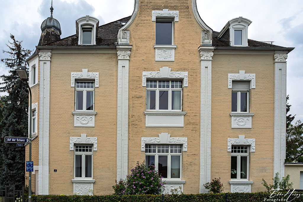 Dass die Fassade an einigen Stellen doch etwas schmutzig ist, fiel mir erst am PC auf. Als ich davorstand, habe ich das gar nicht so bemerkt. Die schöne Haustür im Art Deco-Stil scheint neu sein. Ich habe über dieses Haus (Adresse: „Auf der Schanz“) im Internet leider überhaupt nichts gefunden, was mich schon verwundert hat. Der Bauherr muss zwar gut betucht gewesen sein, aber offenbar niemand von großer Bedeutung im damaligen Örtchen Sossenheim. Er könnte durchaus auch ein höheres Tier bei den Farbwerken Hoechst gewesen sein. Ich schätze mal, dass das Haus um 1900 erbaut wurde.