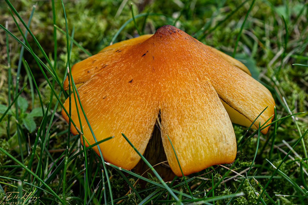 Und noch einer aus unserer Wiese. Die interessante Hutform deutet auf den Schwärzenden Saftling (Hygrocybe nigrescens) hin. Ich muss ihn in den kommenden Tagen mal beobachten, wie er sich weiterentwickelt. Es könnte sich aber auch um den Kegelförmigen Saftling handeln (Hygrocybe conica). Die Arten sind kaum zu unterscheiden. Die Spitzkegeligkeit dieses Exemplars könnte für Hygrocybe conica sprechen. Rita/Kreasoli hat ihn kürzlich als selten beschrieben. Wir haben ihn regelmäßig in der Wiese. Er ist bei uns auch in Parks und auf Friedhöfen recht häufig anzutreffen.