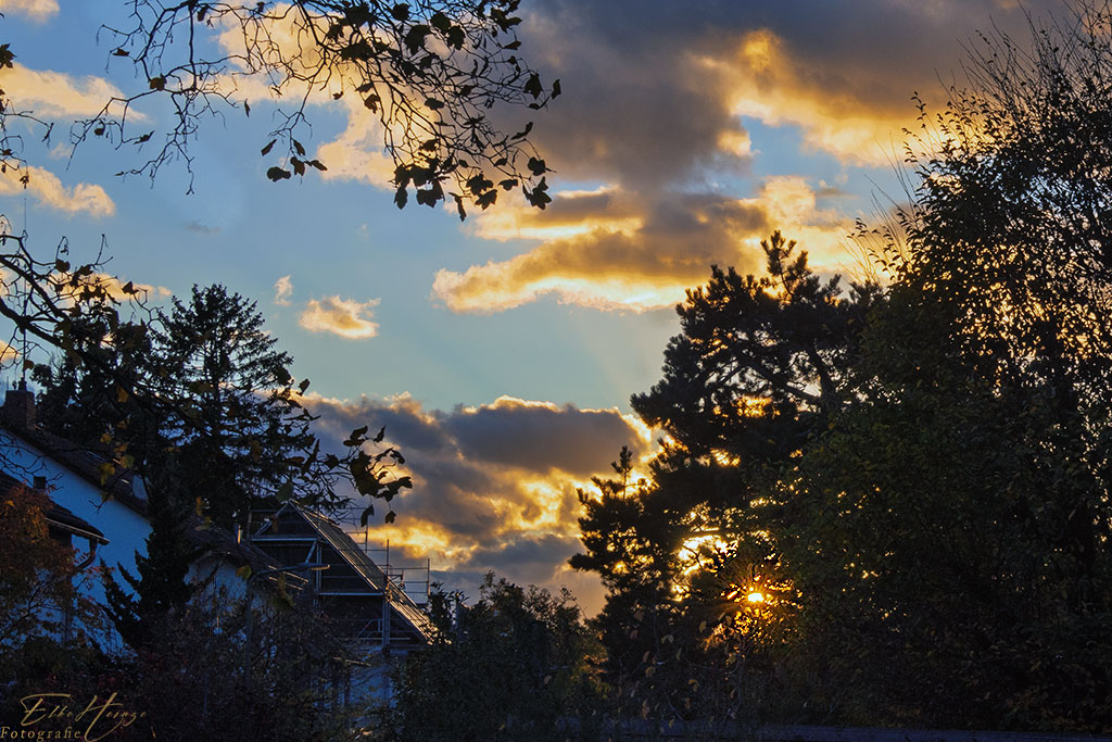 Oh, wir haben gerade einen schönen Sonnenuntergang. Da sollte ich noch ein Foto machen. Es ist erst 16:45 Uhr- nun ja, wir haben wieder Normalzeit. Das ist übrigens wieder so ein Sonnenuntergang, der auf einen Tag fast ohne Sonne folgt. Kalt war’s heute wieder, aber wenigstens trocken. Komischerweise bekommen wir jetzt nochmal einen richtig blauen Himmel.