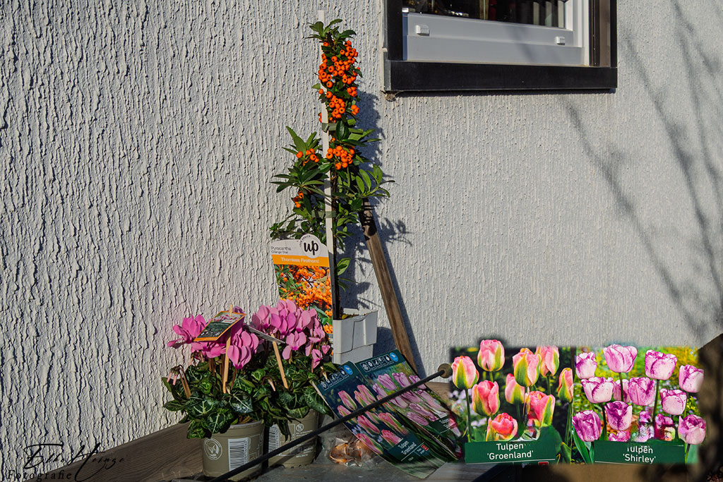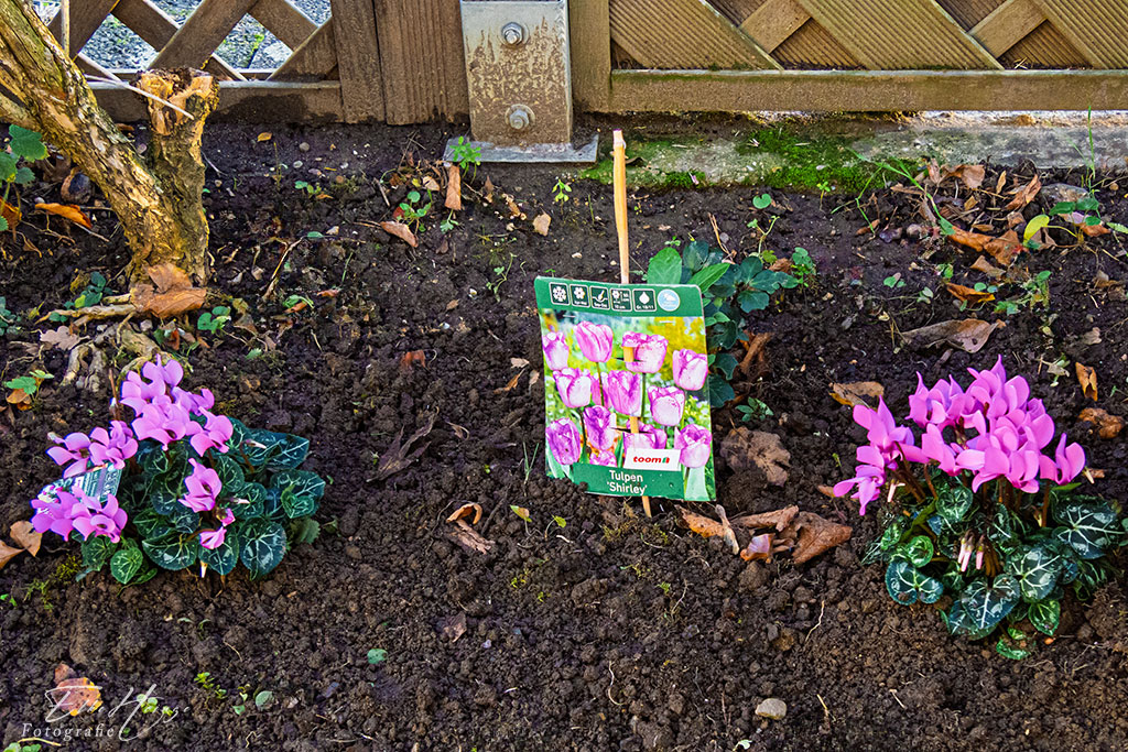 Alpenveilchen und Tulpenzwiebeln habe ich in den Vorgarten gepflanzt. Für den Feuerdorn muss erst noch die kleine, selbst gezogene Kornelkirsche den Platz wechseln. Das soll mal ein richtiger Baum werden und deshalb braucht sie mehr Platz. Ich habe heute schon probehalber ein bisschen gegraben. Sie sollte nicht allzu schwer rausgehen.
