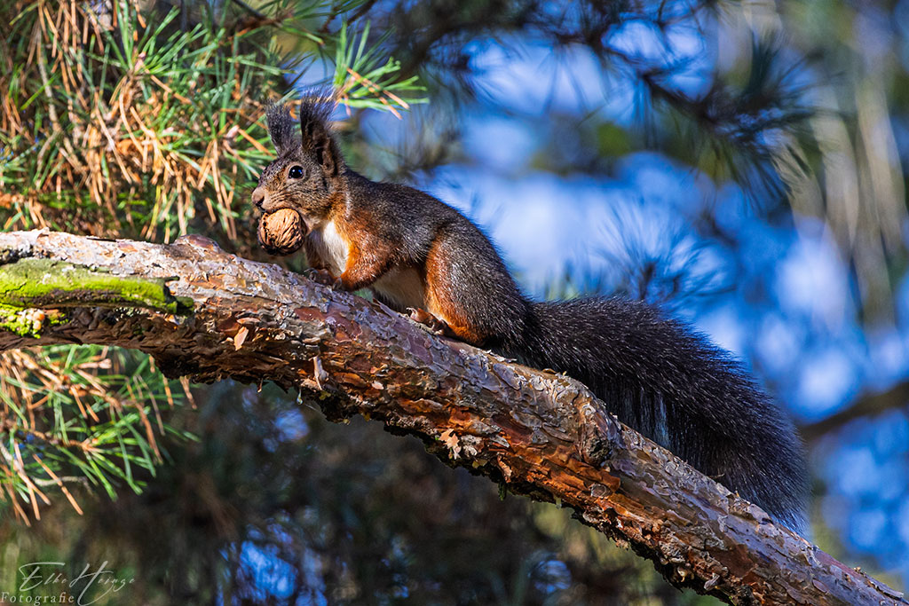 Das Eichhörnchen ist sehr süss wie es mit seiner Nuss herumspaziert.