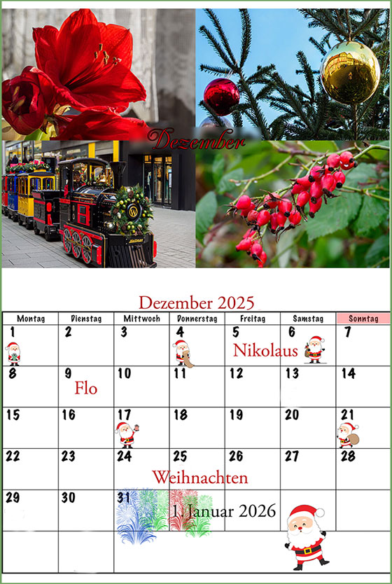 Aufgrund des miesen Wetters habe ich mich mit dem Erstellen von Weihnachtskarten beschäftigt und bei dieser Gelegenheit auch wieder in alten Fotos gestöbert. Ein ordentliches Dezember-Kalenderblatt musste auch noch gestaltet werden. In diesem Jahr habe ich ja die Rückseiten des großen Kalenders von 2024 benutzt, um einen Kalender selbst zu gestalten. Das war nett, aber auch aufwendiger als ich dachte. Oben gibt es immer ein DIN A4 großes Bild, meistens eine Collage mit Motiven, die zum Monat passen. Darunter ein DIN-A4-Blatt mit Kalendarium.
