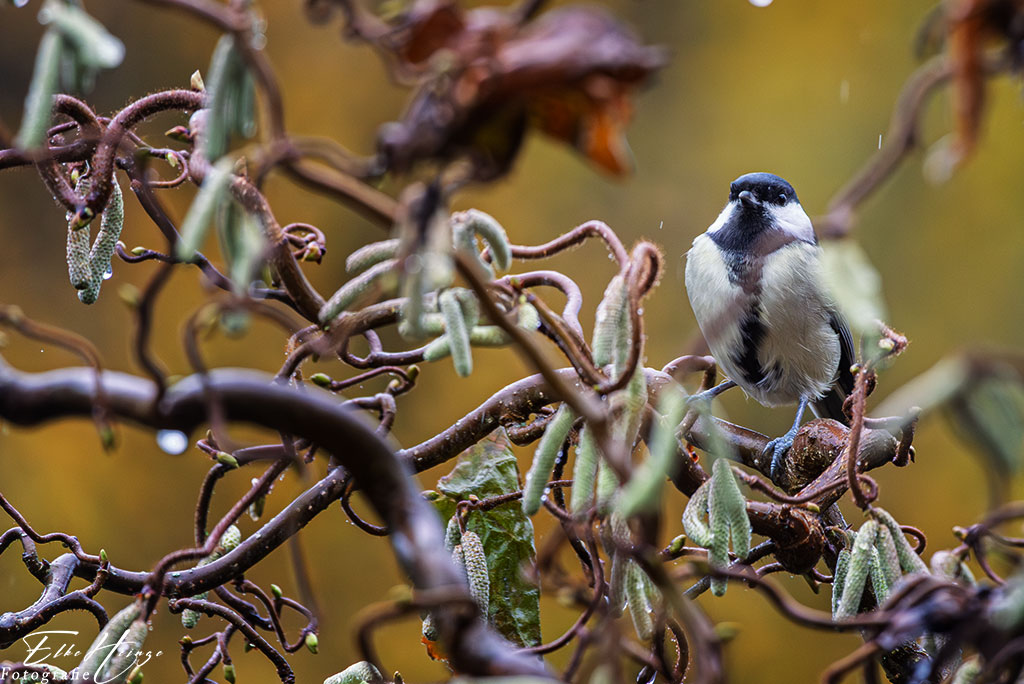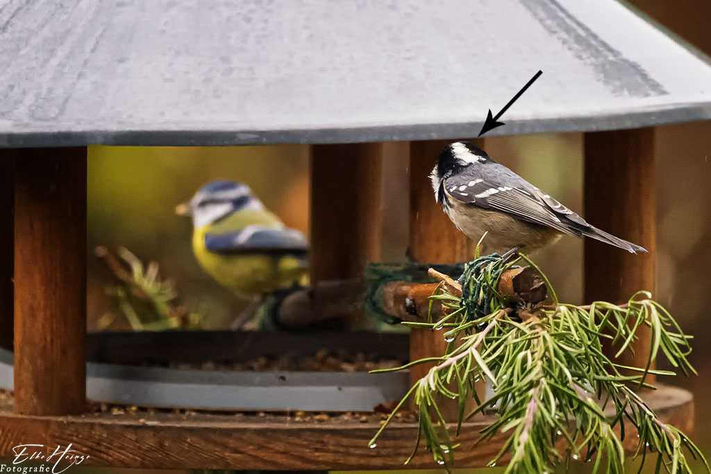 Mein Blick für die Tannenmeise hat sich inzwischen geschärft. Neulich habe ich sie noch mit der Kohlmeise verwechselt. Aber man erkennt sie sehr gut an dem weißen Streifen im sonst schwarzen Nackengefieder. Bei dieser Tannenmeise sieht man den Streifen sehr deutlich. Und ihr Ruf ist dem der Schwanzmeisen ähnlich, so ein leises sirrr-sirrr.