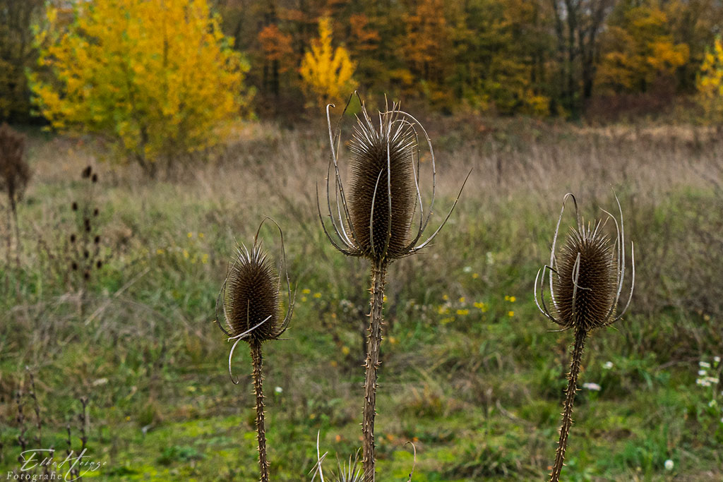 Die buntesten Farben gab es natürlich in den Gärten, aber auch im Feld und den Wiesen blüht immer noch ein bisschen was. Neben den Wiesenglockenblumen habe ich noch Schafgarbe, Storchschnabel, das Berufkraut sowieso, und noch ein paar Kräuter entdeckt. Die verblühten Karden sind den ganzen Winter noch dekorativ.