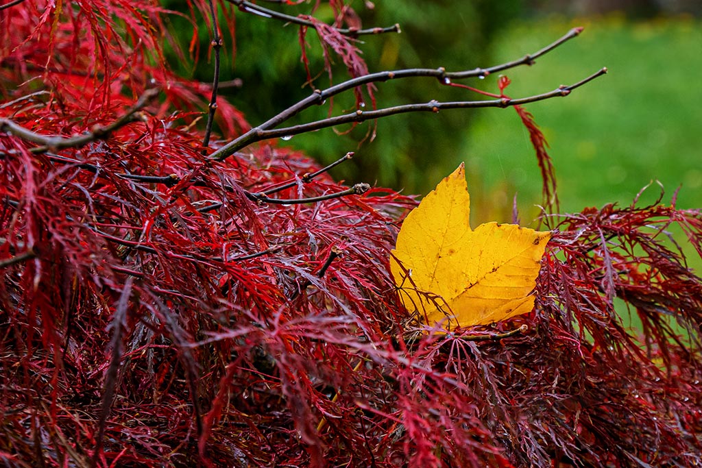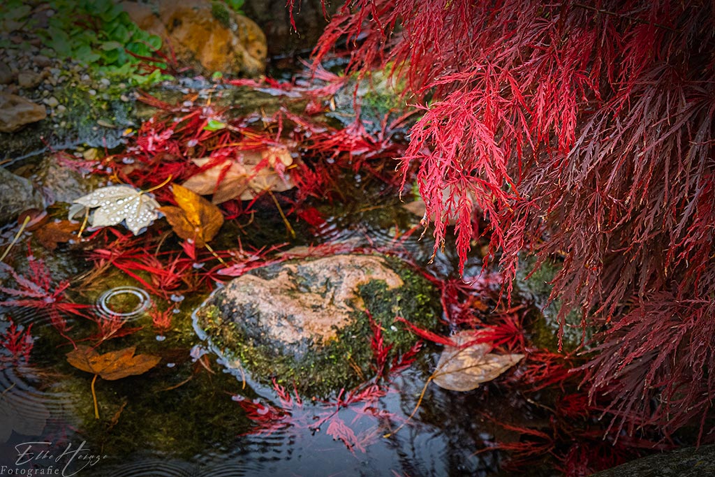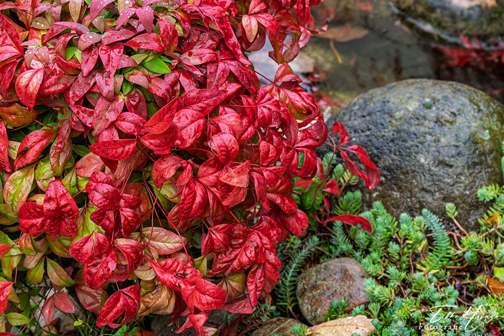 Und natürlich kommt jetzt der kleinere Heilige Bambus wieder voll zur Geltung. Sein knalliges Winterrot ist jedes Jahr aufs Neue faszinierend.