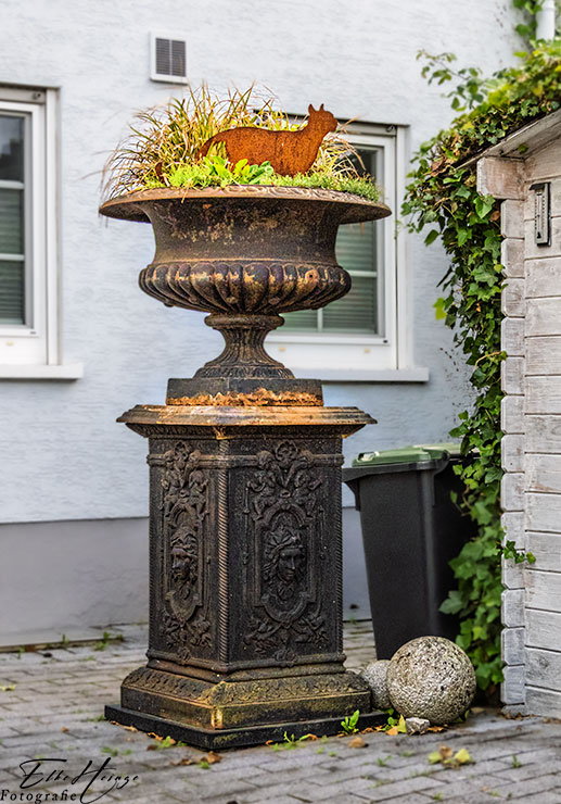 Also, diese Urnensäule mit der Plastikmülltonne und dem sehr nüchternen Haus dahinter, das ist schon ein gewagter Stilmix. Ich finde auch immer diese kitschigen Baumarktlöwen (am besten mit Wappenschild!) vor 08/15-Fertighäusern ziemlich schräg. Aber – wem’s gefällt, nicht wahr?