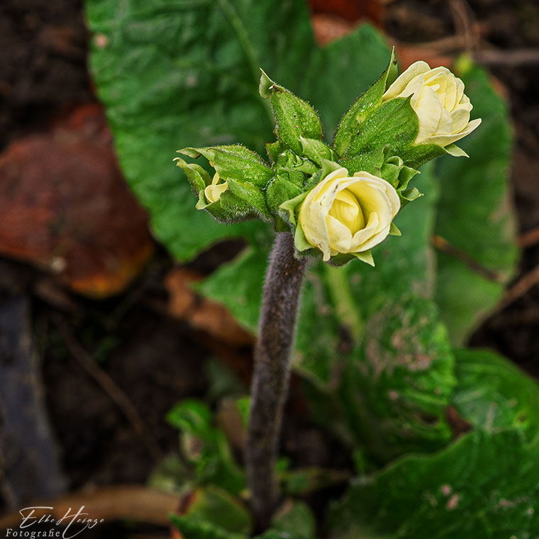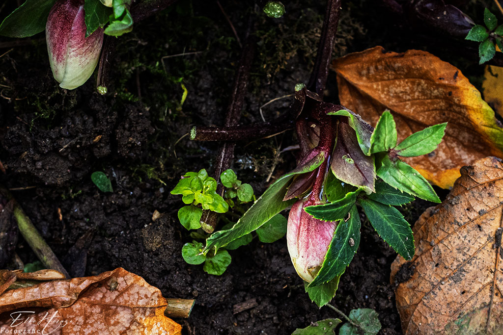 Ich habe im Vorgarten die verblühten Herbstanemonen zurückgeschnitten. Und wie vermutet, zeigten sich unter ihrem Laub, wilden Erdbeerpflanzen und anderem Grünzeug auch schon die ersten Helleborusknospen. Und nicht nur die. Zu meiner Überraschung treibt auch eine Schlüsselblume bereits aus.