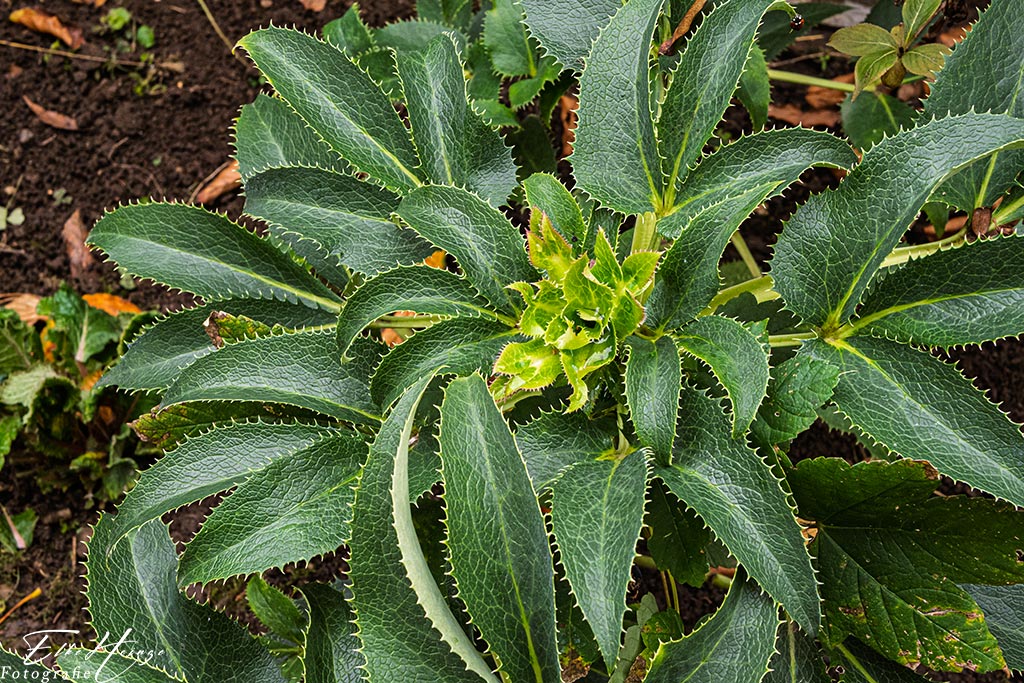 Die wehrhafte Korsische Nieswurz (Helleborus lividus subsp. corsicus) entwickelt gerade sowohl neues Grün als auch Knospen. Die muss ich auch immer kräftig zurückschneiden, damit sie nicht zu üppig wird. Aber das ist eine Pflanze, die wirklich die Bezeichnung „unkaputtbar“ verdient.