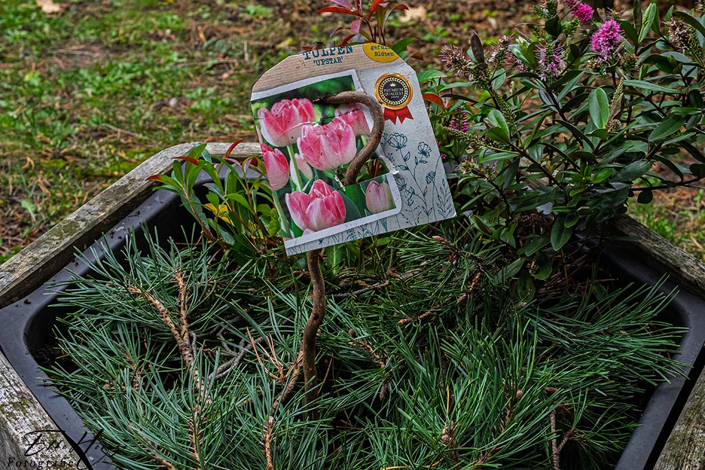 Aus dem sechseckigen Mini-Hochbeet auf der Terrasse mussten mehrere Pflanzen ins Winterquartier. Das ist das alte, große Hochbeet, das fast ausschließlich dafür genutzt wird. Ich hoffe zumindest, dass ich das meiste darin über den Winter bekomme. In den Kasten habe ich nun Tulpenzwiebeln gesetzt. Die Veronica kann bleiben. Sie hat es auch im letzten Winter geschafft.