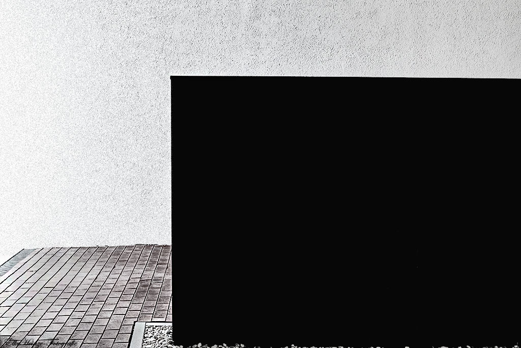Bild Nr. 7 stammt vom selben Gelände. Der Kontrast ist wieder fast schwarz-weiß. Es handelt sich um eine Art Hausflur. Der schwarze „Monolith“ ist die Rückseite einer Briefkastenanlage. Die Fliesen sind eigentlich rötlich. Hier habe ich die Farbe bewusst entsättigt.
