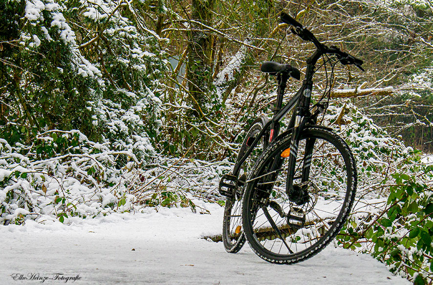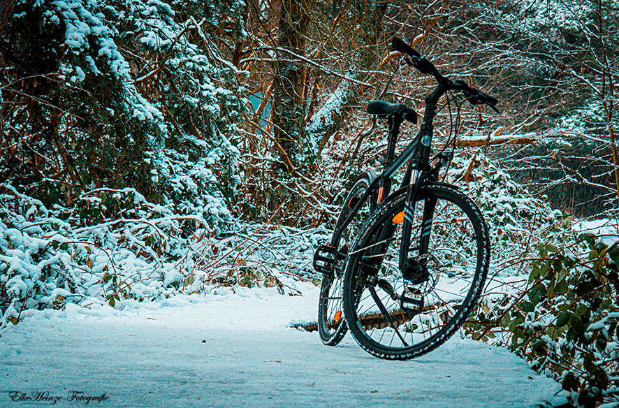 *** Zum Teal & Orange-Look habe ich hier noch ein Winterfoto aus der Schwanheimer Düne in Lightroom bearbeitet. Irgendwer hatte sein Fahrrad auf dem Bohlenweg abgestellt. Ich habe für die Bearbeitung in LR vor allem die Kalibrierungsregler benutzt. Den roten Regler Richtung Orange gezogen und die Sättigung erhöht, den blauen nach links Richtung Cyan und ebenfalls die Sättigung erhöht. Und dann noch ein bisschen mit den normalen HSL-Reglern gespielt.