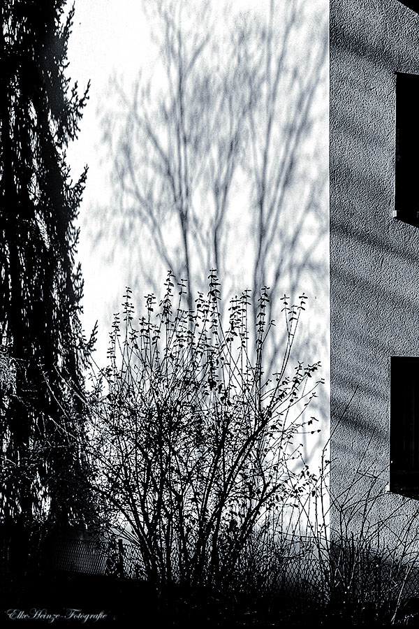 Bild Nr. 2 ist am Mittwoch entstanden, als die Morgensonne Schatten auf die Mauer des Nachbarhauses geworfen hat. In Farbe hätte das Bild nach absolut nichts ausgesehen. Ich habe die Olympus OM-D E-M5 Mark III gleich auf monochrom eingestellt und kameraintern die Kontraste verstärkt.