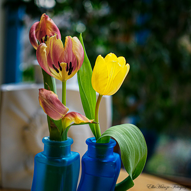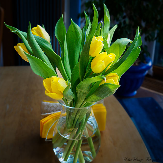 Jetzt aber das Ganze noch einmal in Farbe, denn das Gelb der Tulpen und unser blauer Teppich geben als Komplementärfarben einen perfekten Kontrast.