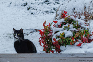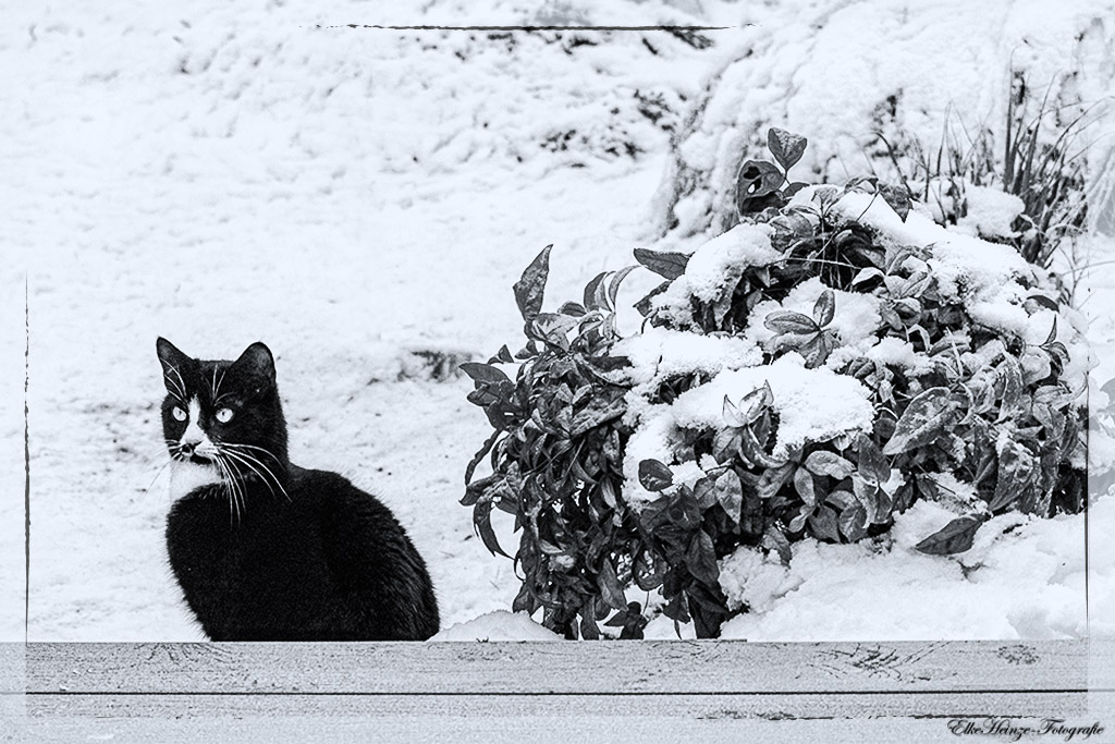 Bild Nr. 1: Minchen im Schnee. Das Bild habe ich zusätzlich mit einem angedeuteten Rahmen versehen. Jetzt sieht es fast aus, als würde Mina direkt ins Fenster gucken. Entwickelt in Lightroom und mit NIK Silver Efex und Color Efex. In Farbe ein Schwarz-Weiß-Rotes „Schneewittchen“-Foto.