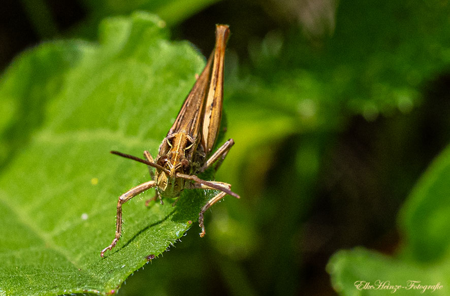 Edith hat ihn als Nachtigall-Grashüpfer (Chorthippus biguttulus) identifiziert. Schau mal hier: YouTube-Video, nicht von mir. – Tolle Nahaufnahme des stridulierenden Grashüpfers.