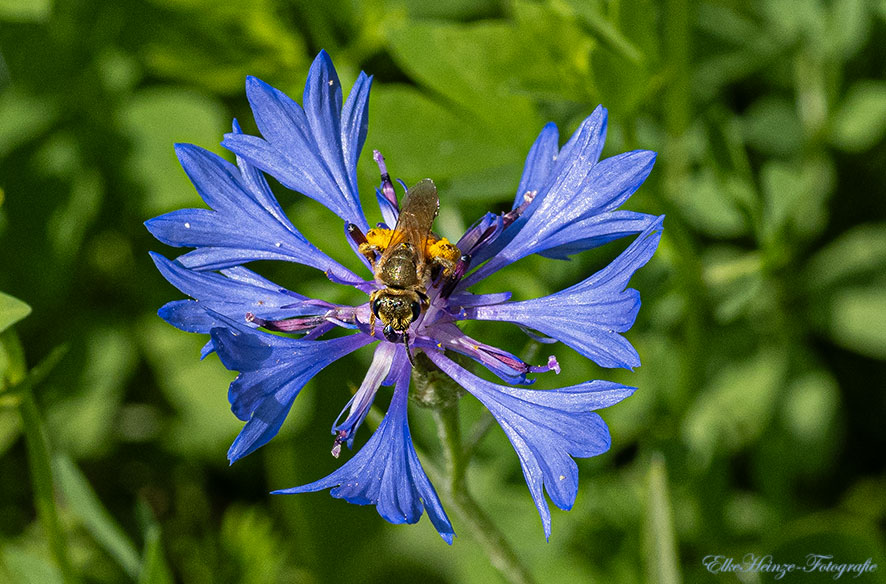 Mein Quadratmeter frisch eingesäte Wildblumen in der sowieso vorhandenen Wildwiese macht mir richtig Freude. Derzeit blühen vor allem kleine Kornblumen. Und werden von winzigen Bienchen besucht. Diese Biene hier ist vielleicht 2 mm groß, die Blüte nicht größer als eine 10 Cent-Münze.