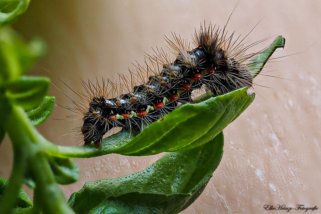 Ich nehme an, dass es die Raupe eines eher unscheinbaren Nachtfalters ist. Da sind die Raupen ja oft hübsch bunt. – Jutta und ich sind für die Raupe der Ampher-Rindeneule (Acronicta rumicis) . Es kann gut sein, dass die grüne seitliche Zeichnung eher weiß ist und nur durch das Basilikumblatt so grün erscheint. Dann passt es.
