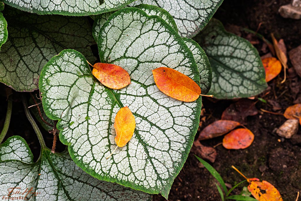 Die Blätter fallen! Optisch machen sich die kleinen kupferfarbenen Blätter auf dem großen Blatt des Kaukasusvergissmeinnichts aber ganz gut.