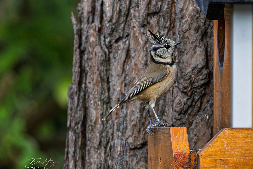 Sie sind vielleicht nicht ganz so niedlich wie die winzigen Schwanzmeisen, aber wunderschön. Charakteristisch ist die schwarz-weiß gemusterte Federhaube. Die Oberseite ist graubraun, Kopf- und Halsseiten sind weiß, eingefasst in ein hinter dem Auge beginnendes, halbmondförmiges schwarzes Band. Die Kehle ist schwarz. Die Unterseite ist crèmefarben. Also ein Vogel mit einer unverkennbaren Zeichnung. Die Haubenmeise ist am ehesten in Nadelwäldern zu finden, kann aber auch in Mischwäldern, Buchenbeständen oder nadelholzreichen Parkanlagen und Gärten vorkommen. Sie bevorzugt Bestände mit viel morschem Holz und tief hinabreichendem Astwerk. Da bekommt sie bei uns (in unserem und den Nachbargärten, meine ich) alles, was sie braucht. Fragt sich nur, wie lange noch.