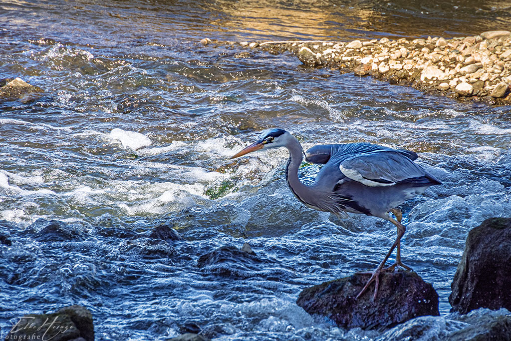 Unter der Brücke steht im Wildwasser ein Reiher und hat auch schon etwas im Blick. Später versucht er es von einem erhöhten Standpunkt aus. Da hat er mehr Überblick und ich das bessere Licht und den besseren Hintergrund zum Fotografieren.