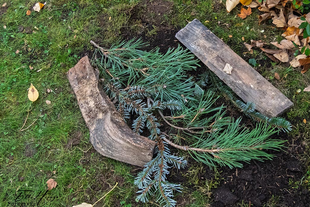 Kein Katzengrab oder dergleichen. Ich habe nur die Stellen, an denen ich Zwiebeln versenkt habe, etwas zu schützen versucht. Nicht, dass sie gleich wieder zum Katzenklo werden. Frische, lockere Erde zieht die ja wie magisch an. Wo ich vor ein paar Tagen die Zwiebeln der Winterlinge versenkt habe, habe ich auch schon wieder einen Haufen entdeckt 😠.