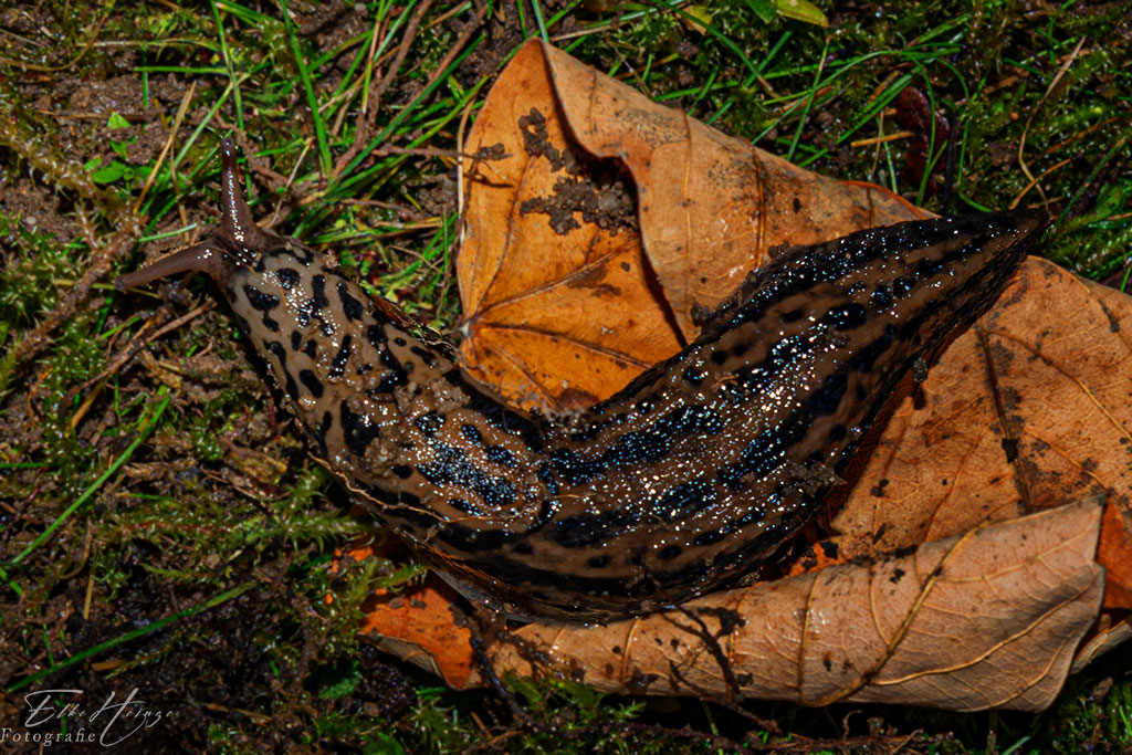 Der Admiral aus der Headerbild hat sich am Mittwoch in der Morgensonne am Stamm der Kiefer aufgewärmt. Den Tigerschnegel habe ich wohl aufgestört, als ich für die Krokuszwiebeln in Heckennähe etwas gegraben habe. Die vielen weißen Lichtpünktchen kommen vom Blitzen. War keine so gute Idee, aber an der Stelle war es finster und ich hatte keine andere Ausleuchtung zur Hand. Tigerschnekel sehe ich relativ selten im Garten, aber sie sind stationär. Ich weiß, dass sie da sind. Ob sie wirklich andere Nacktschnecken fressen, ist nicht hundertprozentig erwiesen.