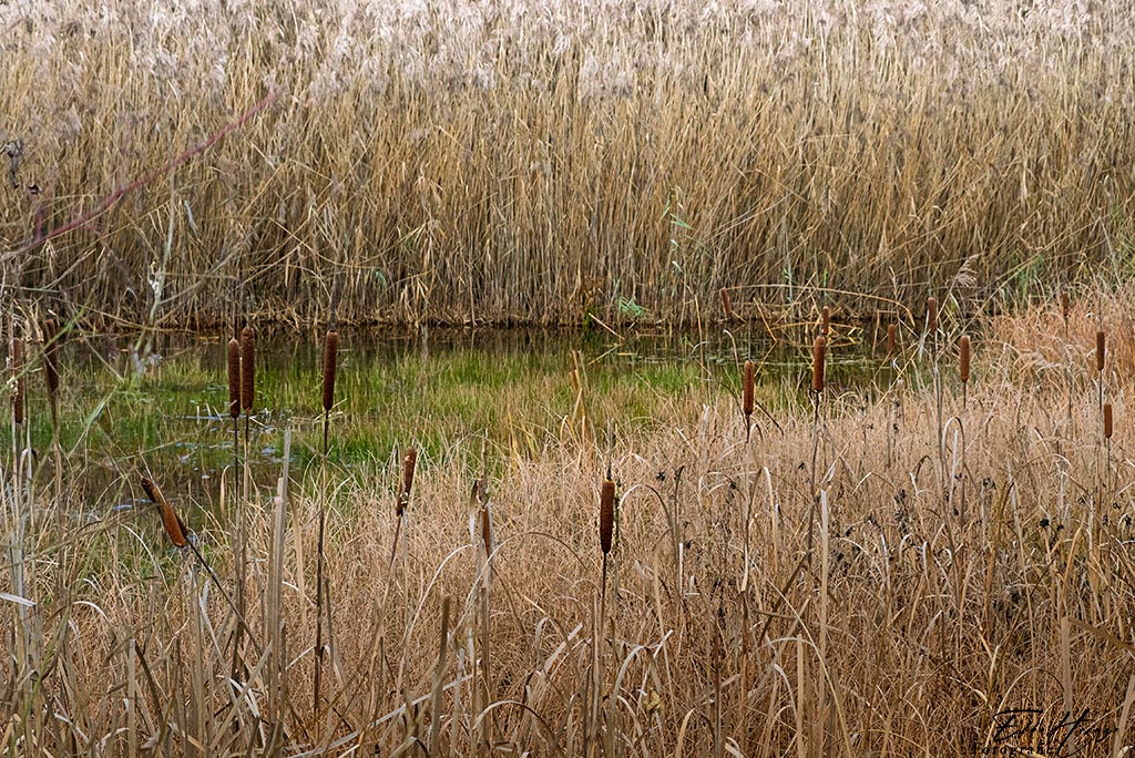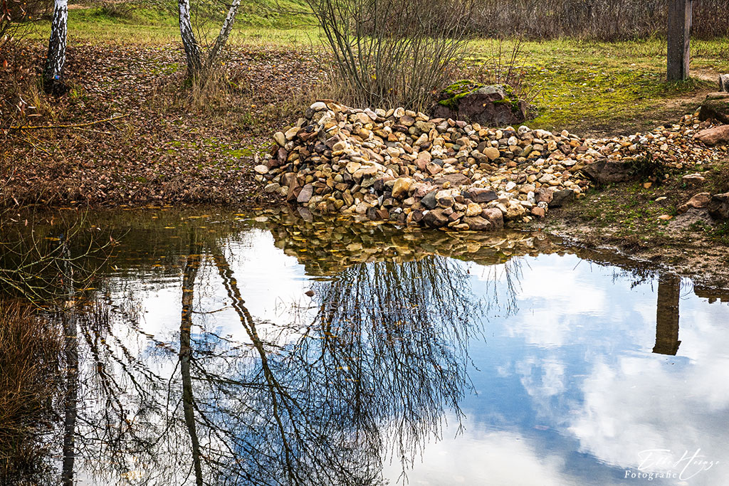 Dieser interessante Steinhaufen im mittleren Tümpel ist neu. Hier war im Sommer ja auch alles ausgetrocknet. Vielleicht soll das ein Refugium mit Restwasser für Molche und Frösche werden. Der große Weiher ist fast komplett zugewachsen, aber ein bisschen Wasser hat er jedenfalls.