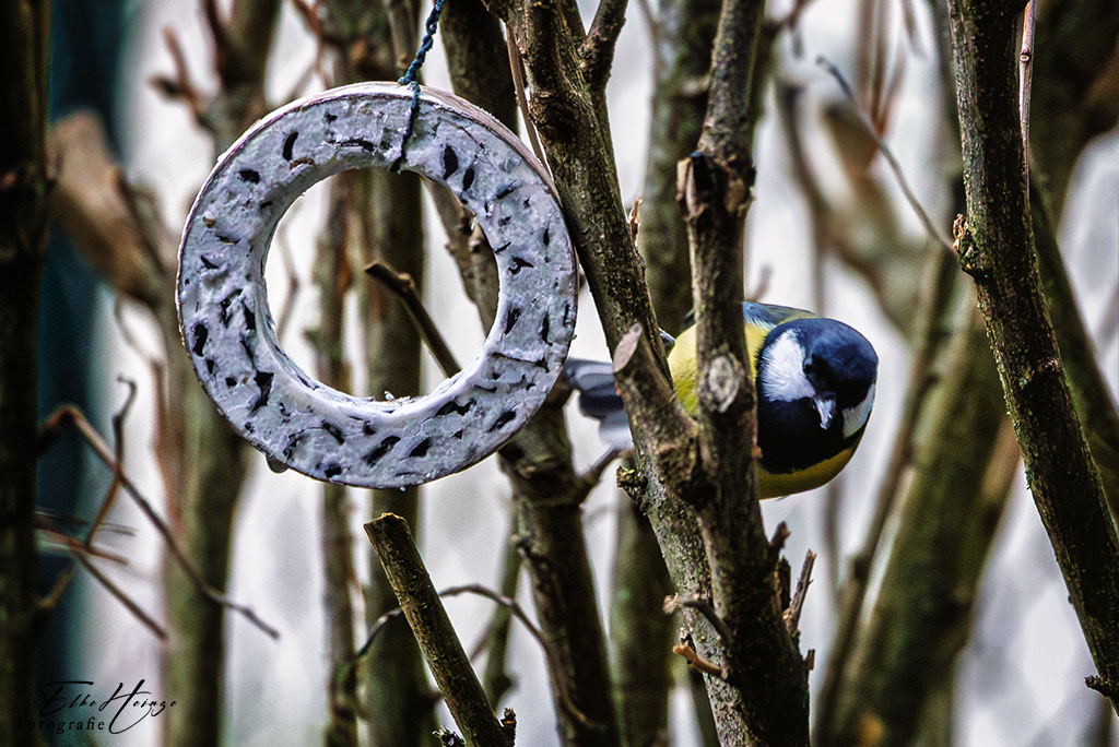 Die Fotos wurden Anfang der Woche bei ziemlich schlechtem Licht aufgenommen, aber mit ein bisschen Bildbearbeitung sind sie vorzeigbar. Der Meisenring sieht inzwischen ziemlich zerfleddert aus. Den haben nämlich inzwischen die Elstern entdeckt!