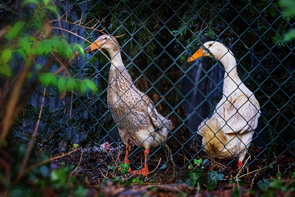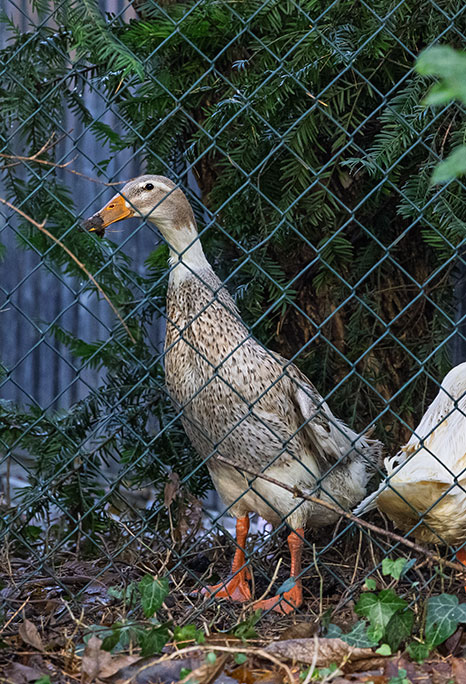 Die Laufenten (sind doch welche, oder?) kann ich leider nicht ohne Zaun abbilden. Da es der übernächste Garten ist, kann ich mich mit der Kamera leider nicht direkt davor positionieren.
