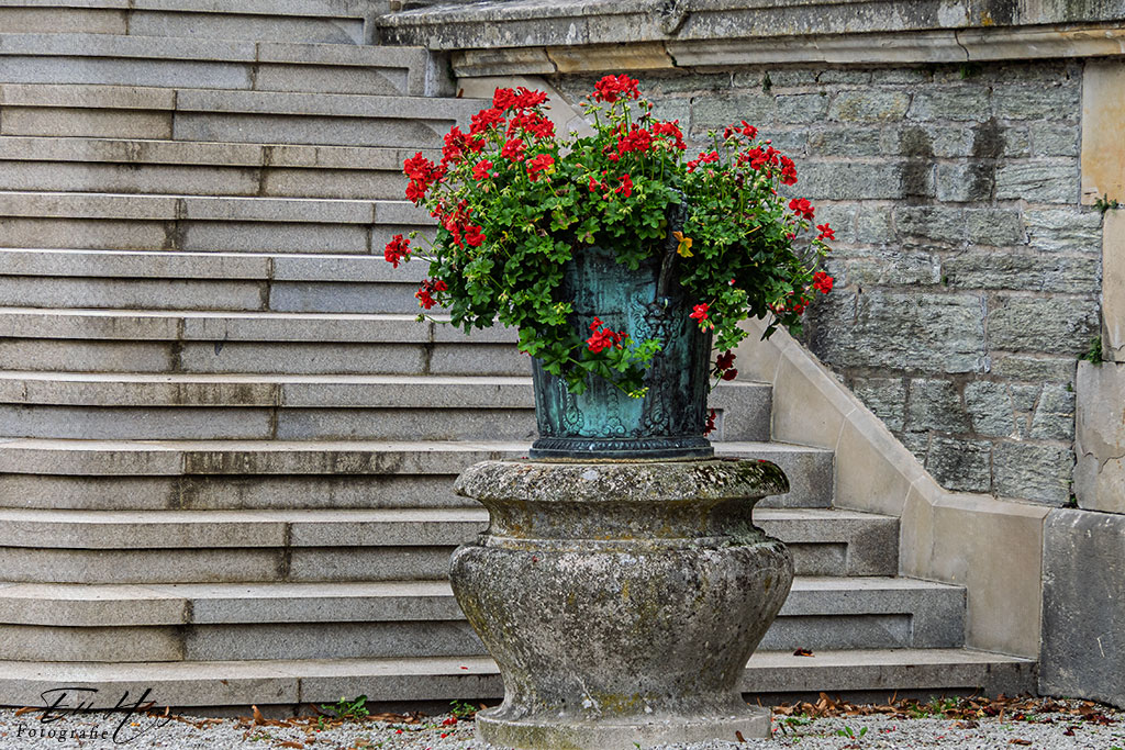 Du zeigst wunderschöne Impressionen vom Schloss, liebe Elke! Ich mag Schlösser immer sehr gerne. Der Blumenkübel ist klasse – und die Libelle auch, tolles Foto. Bei uns fliegen sie im Sommer auch oft ins Wohnzimmer und ich habe Mühe, sie wieder nach draußen zu bringen. Ist das letze herbstbunte Bild dein Garten?