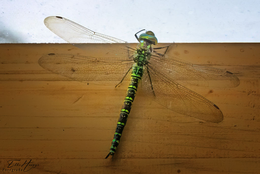 Zuhause habe ich mich eine Weile bei weit geöffneten Türen im Wintergarten aufgehalten und den Blick in den noch immer sonnigen Garten genossen. plötzlich kam mit einem recht lauten „Wusch“ eine Großlibelle hereingeflogen. Ist ja klar, im Sommer im Garten bekommt man sie kaum mal zu Gesicht und jetzt hat man seine liebe Müh und Not sie wieder ins Freie zu befördern. Es ist mir glücklicherweise gelungen.