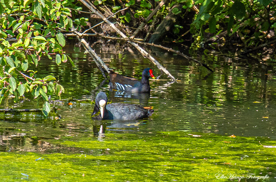 Eine Teichralle mit zwei Jungen. Das Zweite steht direkt vor der Mutter. Man sieht es erst, wenn einem auffällt, dass die Ralle keine vier unterschiedlichen Beine haben kann. 😉 Ausgewachsene Teichrallen erkennt man ja gut an den grünen Beinen. Und natürlich am rot-gelben Schnabel.