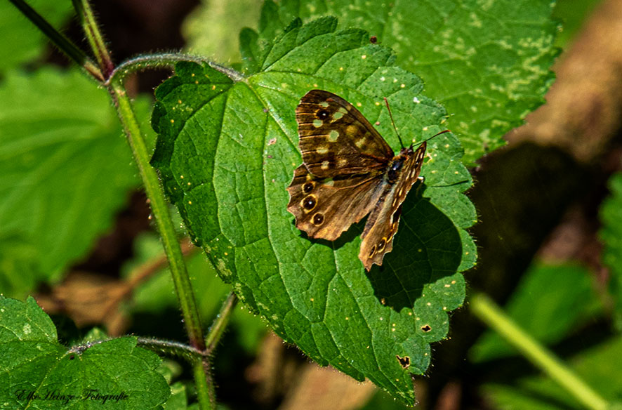Das Waldbrettspiel (Pararge aegeria) gehört zu den Augenfaltern. Sieht das für euch auch so aus, als ob im linken vorderen Flügel anstelle der Augen Löcher sind, durch die man das Blattgrün sieht? Aber vermutlich sind sie nur sehr hell und etwas durchsichtig. Das nächste Foto zeigt einen zweiten Falter. Da sieht man das ganz gut.